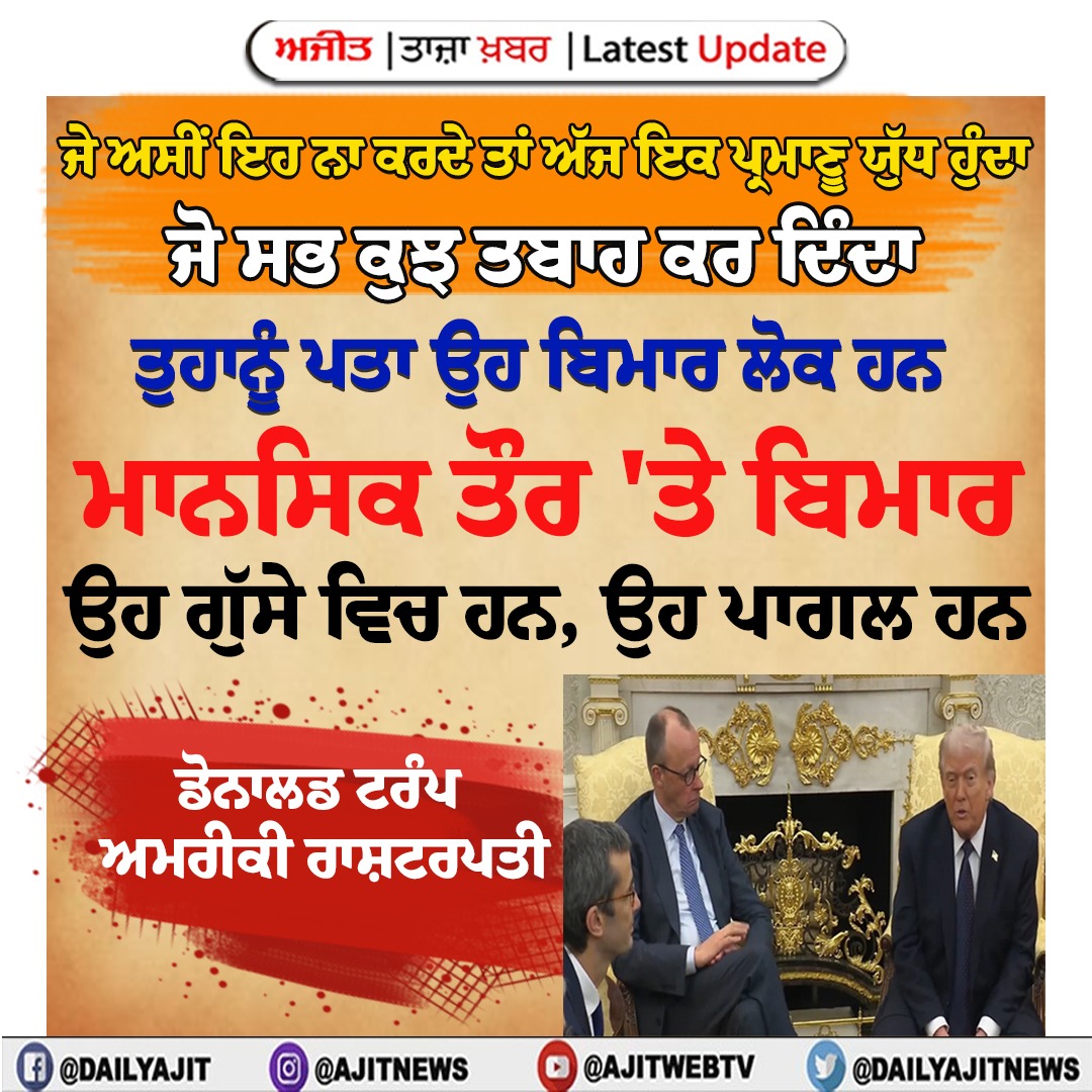 1ਜੇ ਅਸੀਂ ਹਮਲਾ ਨਾ ਕਰਦੇ ਤਾਂ ਅੱਜ ਇਕ ਪ੍ਰਮਾਣੂ ਯੁੱਧ ਹੁੰਦਾ, ਜੋ ਸਭ ਕੁਝ ਤਬਾਹ ਕਰ ਦਿੰਦਾ- ਡੋਨਾਲਡ ਟਰੰਪ