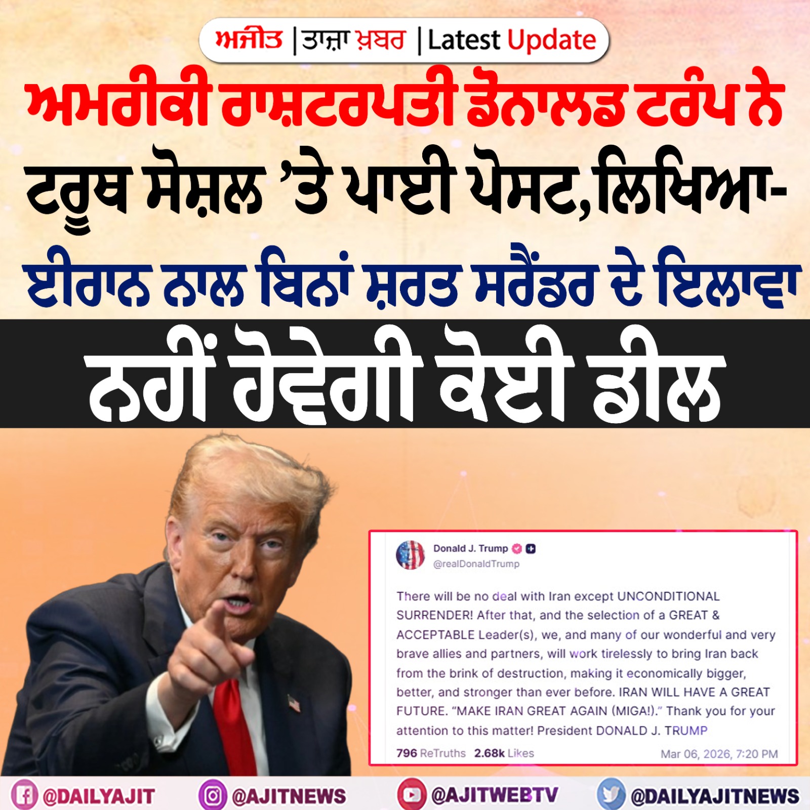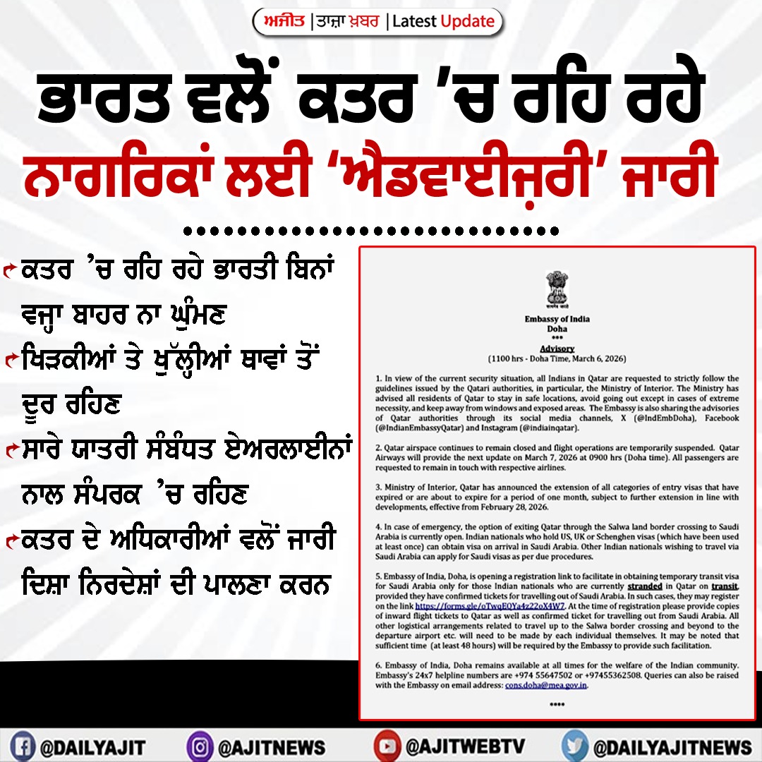 ਨਵੀਂ ਦਿੱਲੀ, 6 ਮਾਰਚ (ਪੀ.ਟੀ.ਆਈ.)-ਖੇਤਰ ’ਚ ਟਕਰਾਅ ਦੇ ਵਿਚਕਾਰ, ਸਰਕਾਰ ਨੇ ਸ਼ੁੱਕਰਵਾਰ ਨੂੰ ਕਿਹਾ ਕਿ ਘਰੇਲੂ ਏਅਰਲਾਈਨਾਂ ਸ਼ੁੱਕਰਵਾਰ ਨੂੰ ਮੱਧ ਪੂਰਬ ਲਈ ਅਤੇ ਉੱਥੋਂ 96 ਉਡਾਣਾਂ ਚਲਾਉਣਗੀਆਂ...