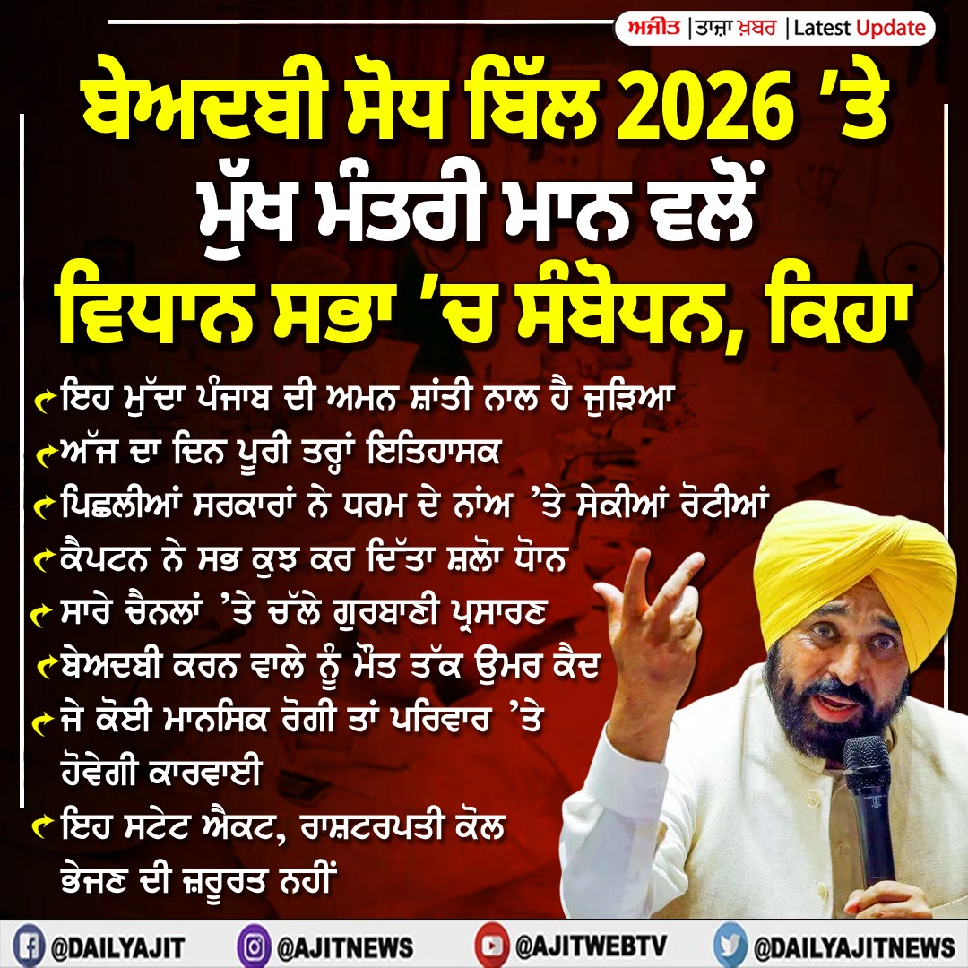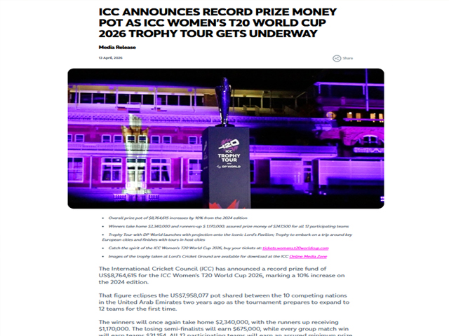 ਦੁਬਈ, 13 ਅਪ੍ਰੈਲ - ਅੰਤਰਰਾਸ਼ਟਰੀ ਕ੍ਰਿਕਟ ਪ੍ਰੀਸ਼ਦ (ਆਈ.ਸੀ.ਸੀ.) ਨੇ ਆਈ.ਸੀ.ਸੀ. ਮਹਿਲਾ ਟੀ-20 ਵਿਸ਼ਵ ਕੱਪ 2026 ਲਈ 8,764,615 ਅਮਰੀਕੀ ਡਾਲਰ ਦੀ ਰਿਕਾਰਡ ਇਨਾਮੀ ਰਾਸ਼ੀ...