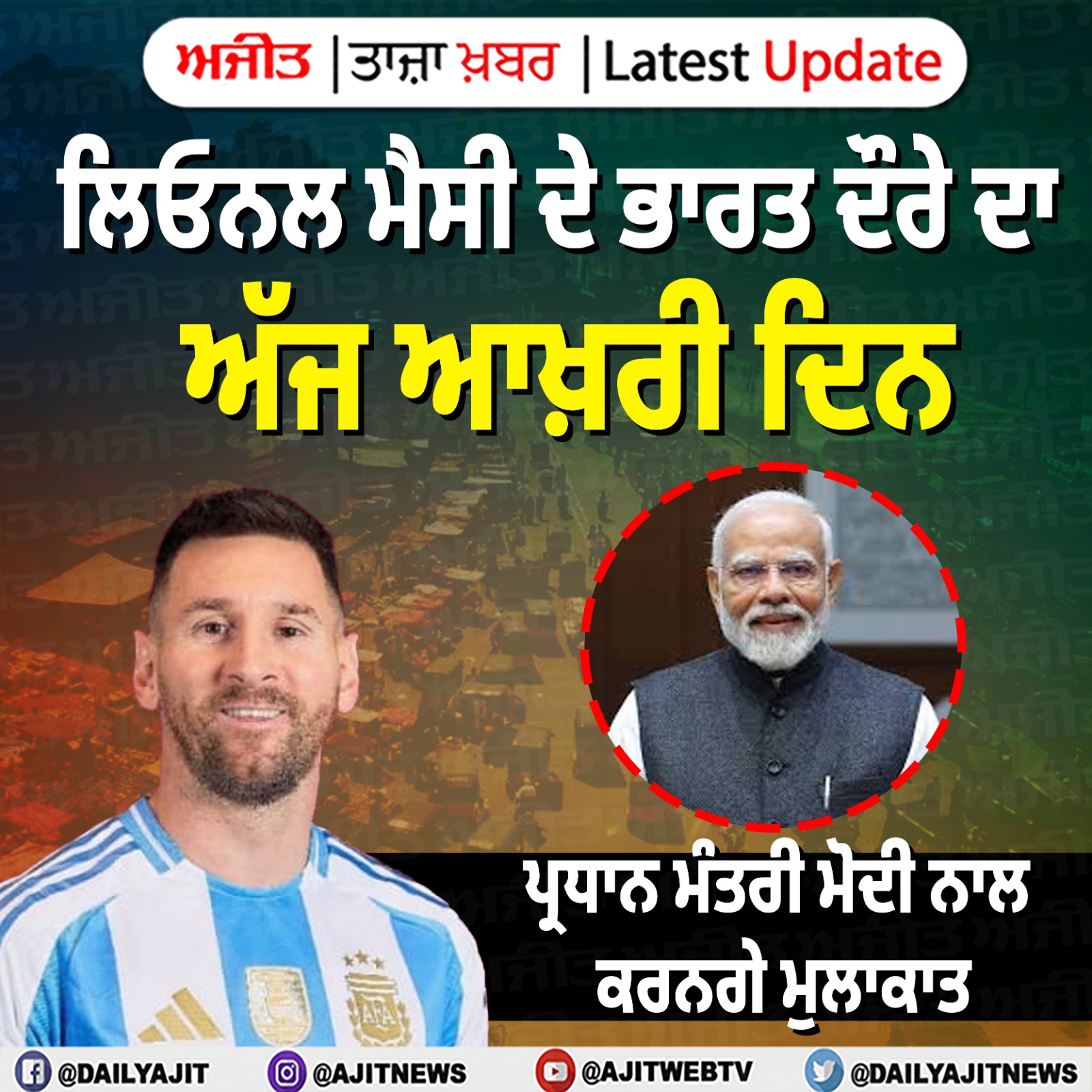 ਨਵੀਂ ਦਿੱਲੀ, 15 ਦਸੰਬਰ- ਅਰਜਨਟੀਨਾ ਦੇ ਦਿੱਗਜ ਫੁੱਟਬਾਲਰ ਲਿਓਨਲ ਮੈਸੀ ਇਸ ਸਮੇਂ ਭਾਰਤ ਦੌਰੇ 'ਤੇ ਹਨ। ਮੈਸੀ ਦਾ ਦੌਰਾ ਸ਼ਨੀਵਾਰ ਨੂੰ ਕੋਲਕਾਤਾ ਤੋਂ ਸ਼ੁਰੂ ਹੋਇਆ ਸੀ। ਐਤਵਾਰ ਨੂੰ ਮੈਸੀ ਮੁੰਬਈ ਪਹੁੰਚੇ, ਜਿਥੇ ਉਨ੍ਹਾਂ ਨੇ ਵੱਖ-ਵੱਖ ਪ੍ਰੋਗਰਾਮਾਂ ਵਿਚ ਹਿੱਸਾ ਲਿਆ। ਅੱਜ ਮੈਸੀ ਆਪਣੇ ਭਾਰਤ ਦੌਰੇ ਦੇ ਆਖਰੀ ਪੜਾਅ ਤਹਿਤ ਦਿੱਲੀ ਪਹੁੰਚਣਗੇ, ਜਿਥੇ ਉਹ ਪ੍ਰਧਾਨ ਮੰਤਰੀ ਨਰਿੰਦਰ ਮੋਦੀ ਨਾਲ ਮੁਲਾਕਾਤ ਕਰਨਗੇ। ਮੈਸੀ ਪ੍ਰਧਾਨ ਮੰਤਰੀ ਮੋਦੀ ਨਾਲ ਉਨ੍ਹਾਂ ਦੇ ਸਰਕਾਰੀ ਨਿਵਾਸ ਸਥਾਨ 'ਤੇ ਮੁਲਾਕਾਤ ਕਰਨਗੇ। ਇਸ ਤੋਂ ਬਾਅਦ ਉਨ੍ਹਾਂ ਦੇ ਇੱਕ ਸੰਸਦ ਮੈਂਬਰ ਦੇ ਨਿਵਾਸ ਸਥਾਨ 'ਤੇ ਭਾਰਤ ਦੇ ਚੀਫ਼ ਜਸਟਿਸ ਅਤੇ ਫੌਜ ਮੁਖੀ ਨਾਲ ਮੁਲਾਕਾਤ ਕਰਨ ਦੀ ਵੀ ਰਿਪੋਰਟ ਹੈ। ਜੀ.ਓ.ਏ.ਟੀ. ਦੇ ਭਾਰਤ ਦੌਰੇ ਦੇ ਆਖਰੀ ਦਿਨ ਮੈਸੀ ਫਿਰੋਜ਼ਸ਼ਾਹ ਕੋਟਲਾ ਸਟੇਡੀਅਮ ਵਿਚ ਭਾਰਤੀ ਕ੍ਰਿਕਟ ਟੀਮ ਦੇ ਦੋ ਮੈਂਬਰਾਂ ਨੂੰ ਵੀ ਮਿਲਣਗੇ।