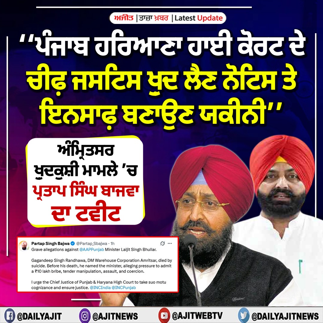 ਦੱਸ ਦੇਈਏ ਕਿ ਪੰਜਾਬ ਰਾਜ ਵੇਅਰਹਾਊਸ ਕਾਰਪੋਰੇਸ਼ਨ ਦੇ ਅੰਮ੍ਰਿਤਸਰ ਜ਼ਿਲ੍ਹਾ ਮੈਨੇਜਰ (ਡੀਐਮ) ਗਗਨਦੀਪ ਸਿੰਘ ਰੰਧਾਵਾ ਨੇ ਕਥਿਤ ਤੌਰ 'ਤੇ ਖੁਦਕੁਸ਼ੀ ਦੀ ਕੋਸ਼ਿਸ਼ ਕੀਤੀ। ਉਨ੍ਹਾਂ ਨੇ ਇਸ ਲਈ ਆਮ ਆਦਮੀ ਪਾਰਟੀ (ਆਪ) ਸਰਕਾਰ ਦੇ ਇਕ ਮੰਤਰੀ ਨੂੰ ਜ਼ਿੰਮੇਵਾਰ ਠਹਿਰਾਇਆ।