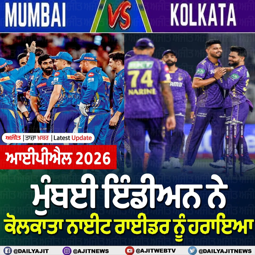 ਆਈਪੀਐਲ 2026- ਕੋਲਕਾਤਾ ਨੇ ਮੁੰਬਈ ਨੂੰ ਦਿੱਤਾ 221 ਦੌੜਾਂ ਦਾ ਟੀਚਾ