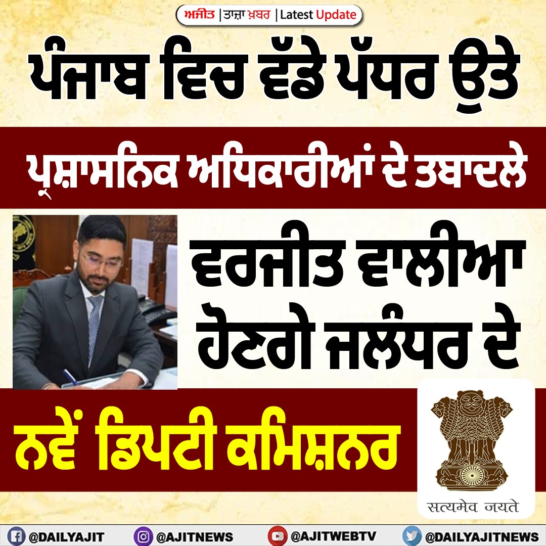 ਚੰਡੀਗੜ੍ਹ, 6 ਅਪ੍ਰੈਲ- ਪੰਜਾਬ ਸਰਕਾਰ ਵਲੋਂ ਪ੍ਰਸ਼ਾਸਨਿਕ ਅਧਿਕਾਰੀਆਂ ਦੇ ਵੱਡੇ ਪੱਧਰ ਉਤੇ ਤਬਾਦਲੇ ਕੀਤੇ ਗਏ ਹਨ। ਵਰਜੀਤ ਵਾਲੀਆ ਜਲੰਧਰ ਦੇ ਨਵੇਂ ਡਿਪਟੀ ਕਮਿਸ਼ਨਰ ਹੋਣਗੇ। ਜਦਕਿ  ਹਿਮਾਂਸ਼ੂ ਅਗਰਵਾਲ ਹੁਣ ਪਟਿਆਲਾ ਦੇ ਨਵੇਂ ਡਿਪਟੀ ਕਮਿਸ਼ਨਰ ਹੋਣਗੇ। ਦੇਖੋ ਲਿਸਟ...