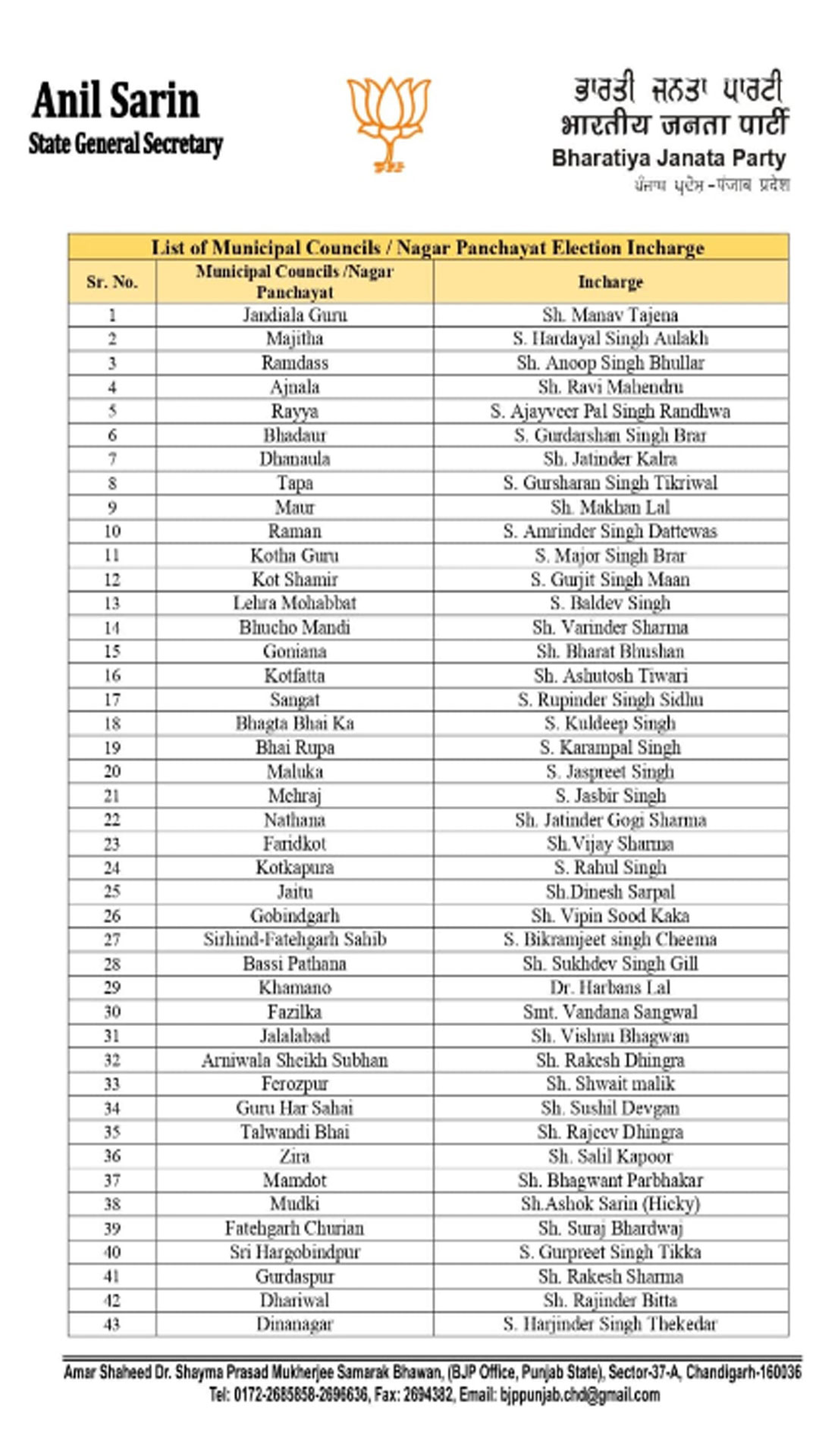 ਭਾਜਪਾ ਪੰਜਾਬ ਨੇ ਖਿੱਚੀ ਤਿਆਰੀ - ਨਗਰ ਨਿਗਮਾਂ ਅਤੇ ਨਗਰ ਕੌਂਸਲਾਂ ਲਈ ਇੰਚਾਰਜ ਅਤੇ ਸਹਿ ਇੰਚਾਰਜ ਕੀਤੇ ਨਿਯੁਕਤ