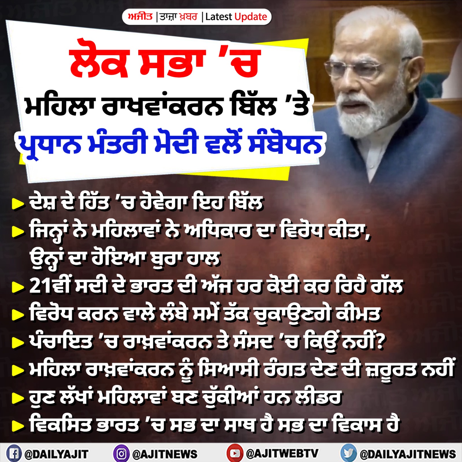 12 ਪ੍ਰਧਾਨ ਮੰਤਰੀ ਮੋਦੀ ਨੇ ਮਹਿਲਾ ਰਾਖਵਾਂਕਰਨ ਸੋਧ ਬਿੱਲ ਲਈ ਸਰਬਸੰਮਤੀ ਨਾਲ ਸਮਰਥਨ ਦੀ ਕੀਤੀ ਮੰਗ