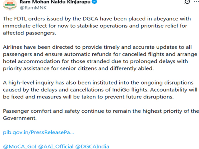 ਕੇਂਦਰੀ ਸ਼ਹਿਰੀ ਤੇ ਹਵਾਬਾਜੀ ਮੰਤਰੀ ਨੇ ਟਵੀਟ ਕਰਕੇ ਦੱਸਿੱਆ, "ਇੰਡੀਗੋ ਉਡਾਣਾਂ ਵਿਚ ਦੇਰੀ ਅਤੇ ਰੱਦ ਹੋਣ ਕਾਰਨ ਪੈਦਾ ਹੋਈਆਂ ਸਮੱਸਿਆਵਾਂ ਦੀ ਉੱਚ ਪੱਧਰੀ ਜਾਂਚ ਵੀ ਸ਼ੁਰੂ ਕਰ ਦਿੱਤੀ ਗਈ ਹੈ। ਜਵਾਬਦੇਹੀ ਤੈਅ ਕੀਤੀ ਜਾਵੇਗੀ ਅਤੇ ਭਵਿੱਖ ਵਿੱਚ ਅਜਿਹੀਆਂ ਸਮੱਸਿਆਵਾਂ ਨੂੰ ਰੋਕਣ ਲਈ ਕਦਮ ਚੁੱਕੇ ਜਾਣਗੇ। ਯਾਤਰੀ ਸੁਰੱਖਿਆ ਸਰਕਾਰ ਦੀ ਸਭ ਤੋਂ ਵੱਡੀ ਤਰਜੀਹ ਬਣੀ ਹੋਈ ਹੈ।"