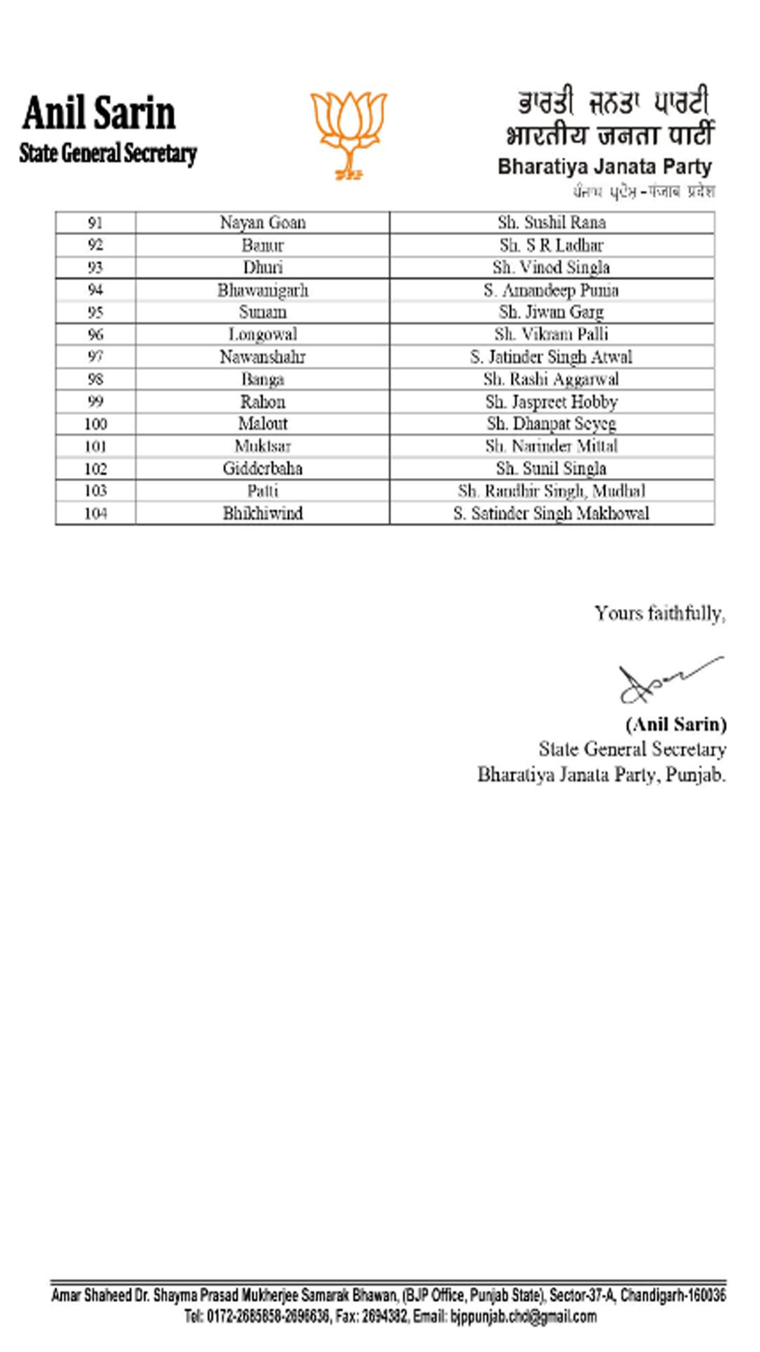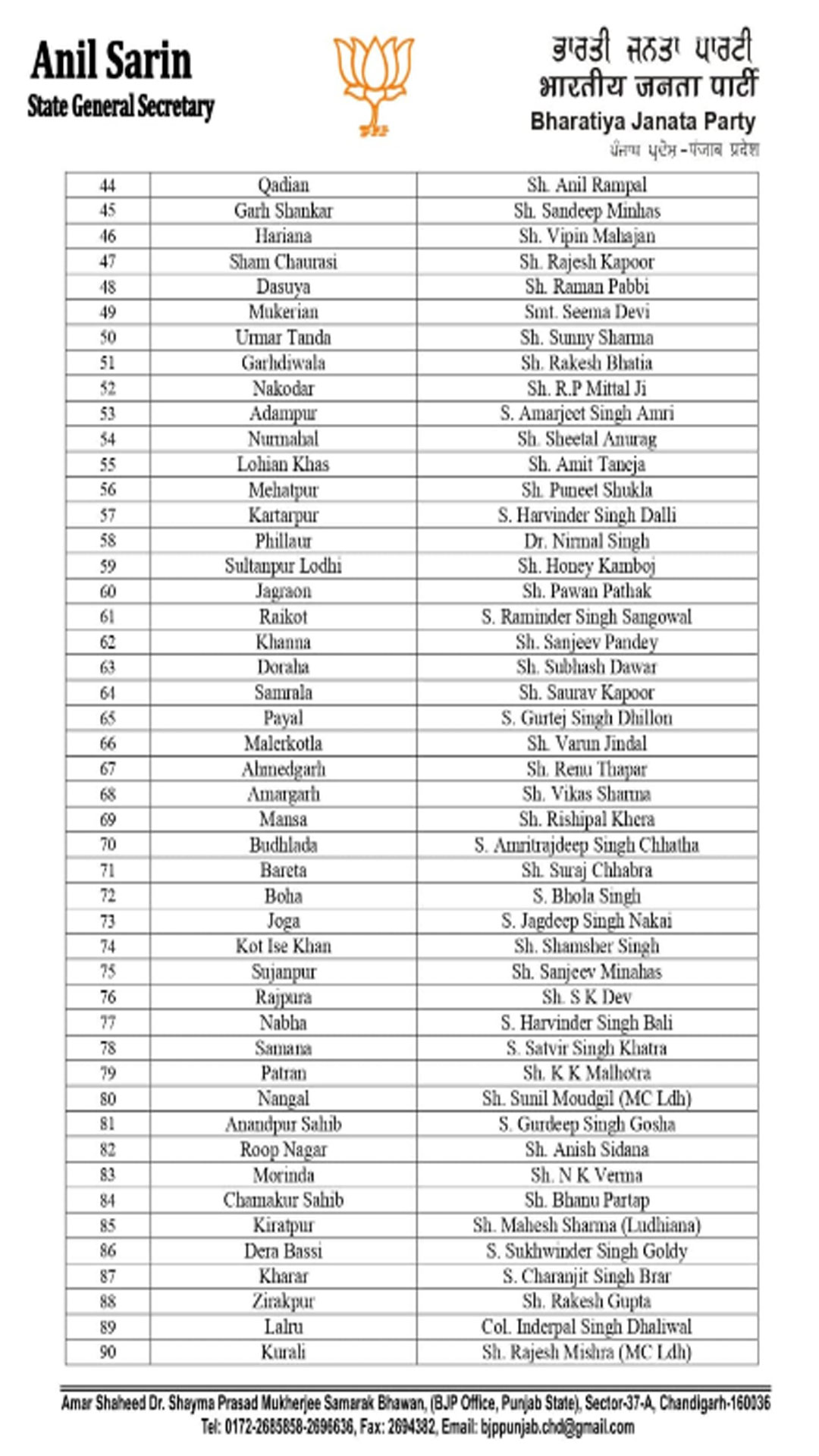ਭਾਜਪਾ ਪੰਜਾਬ ਨੇ ਖਿੱਚੀ ਤਿਆਰੀ - ਨਗਰ ਨਿਗਮਾਂ ਅਤੇ ਨਗਰ ਕੌਂਸਲਾਂ ਲਈ ਇੰਚਾਰਜ ਅਤੇ ਸਹਿ ਇੰਚਾਰਜ ਕੀਤੇ ਨਿਯੁਕਤ